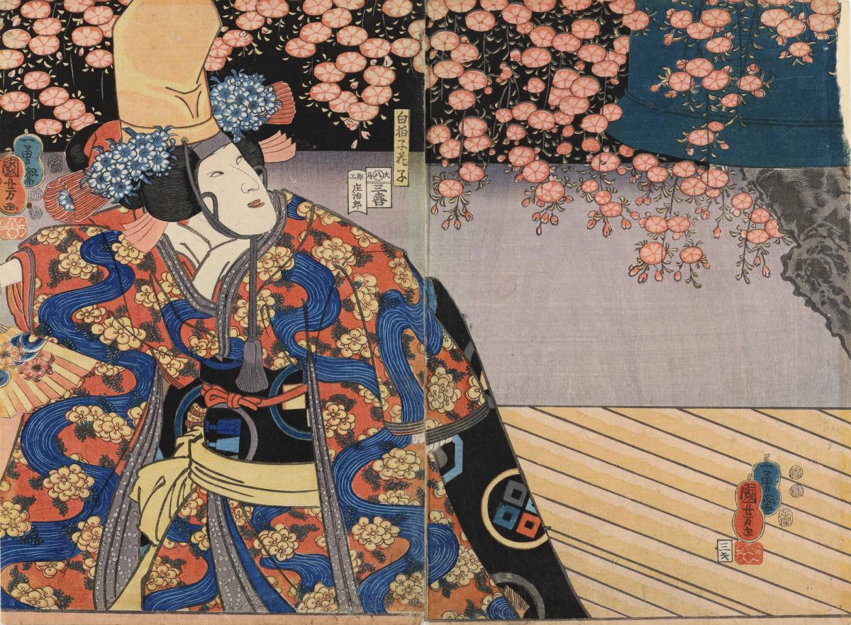 Bando Shuka as the Shirabyoshi Hanako, with Seki Sanjuro and Arashi Kichisaburo as the priests Kongara-bo and Seitaka-bo