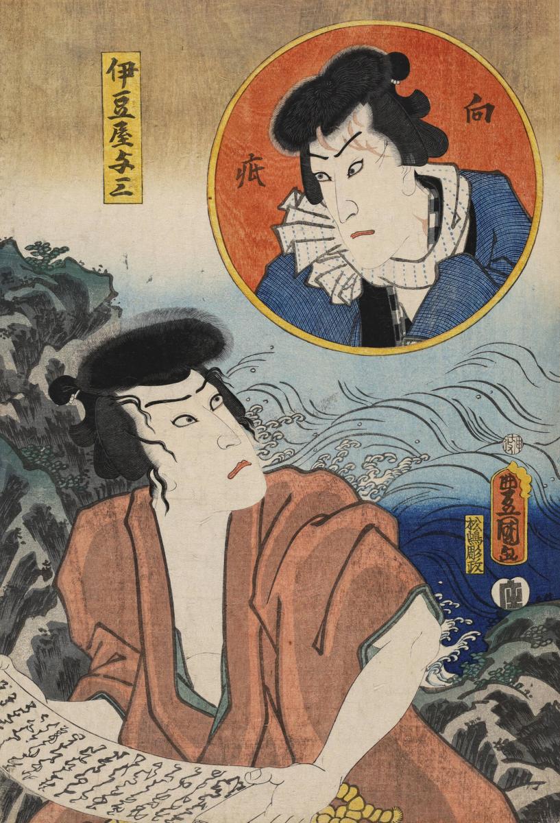 Actors Kawarasaki Gonjūrō I as Izuya Yosa and the late Ichikawa Danjūrō VIII as Mukokizu in the play Kirare Yosa