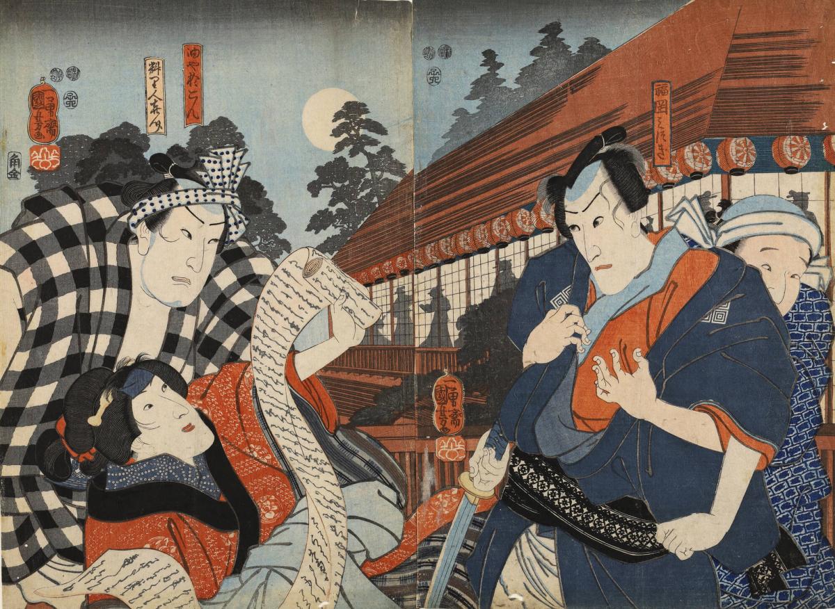 Actors Ichikawa Danjûrô VIII as Fukuoka Mitsugi, Iwai Kumesaburô III as Aburaya Okon, and Arashi Rikan III as Chef (Ryôrinin) Kisuke