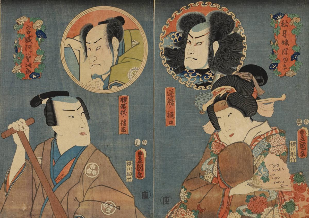 Actors Onoe Kikujirô II as Shûgetsu's Daughter Musume Fukayuki, Nakamura Fukusuke I as Gyakuro no Higuchi, Seki Sanjûrô III as Koshigoejô no Gotô, and Nakamura Fukusuke I as Miyagi Asojirô