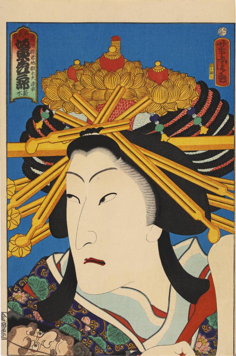 Bando Hisosaburo V as Jigoku Dayu, from the series: Contemporary Portraits of Actors and their Handwriting (Tosei jihitsu kagami); series begun by Toyokuni III and continued by Yoshitora