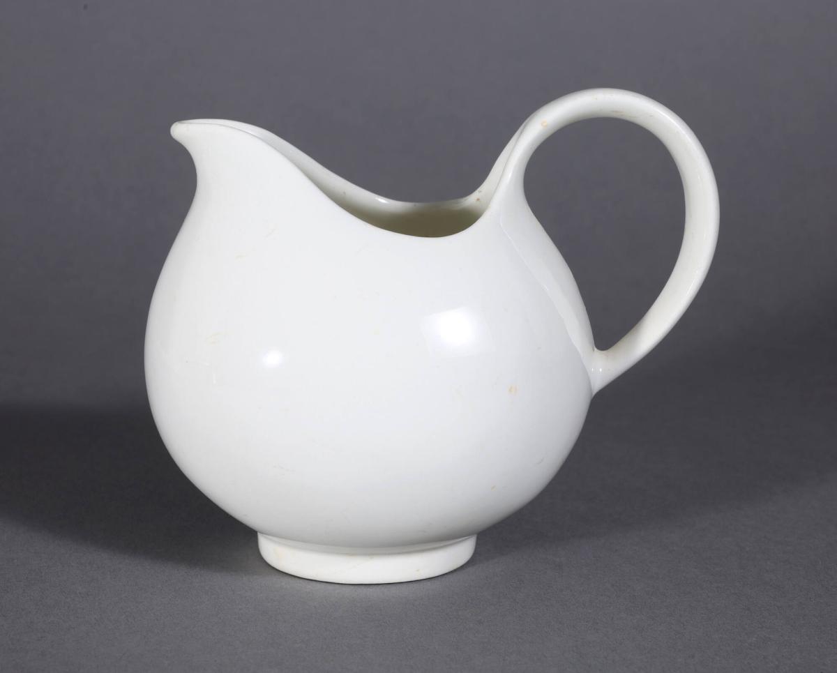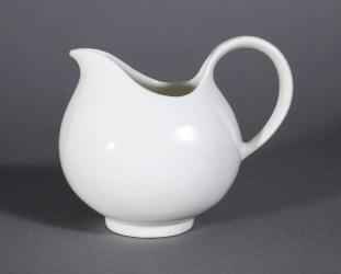 Imported porcelain from East Asia, often called “fine china,” was a prized luxury in Europe, so valuable that huge resources were expended to try to reverse-engineer it. Success only came in the early 18th century at Meissen in today’s eastern Germany. By the 20th century, porcelain was mass-produced and widely available in forms ranging from sinks and toilets for everyday use to elegant dinnerware or coffee and tea services for special occasions. This stylish creamer is from a tea service produced for Hall China Company in East Liverpool, Ohio. The pure white porcelain combined with the smooth, organic forms of the vessels represent the achievements of Zeisel, one of the most influential American designers of the 20th century.
