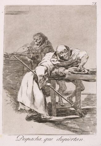 Despacha, que dispiértan. (Be quick, they are waking up), plate 78 from the first edition of Los Caprichos (Madrid, 1799)