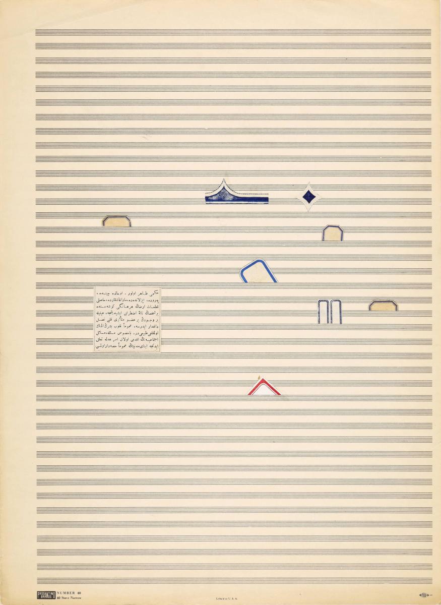 MediumPaper labels, rubber stamp, attached paper of Arabic text on Passantino Brands sheet music paper