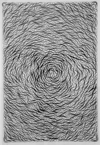 Not on viewDonovan works with everyday material such as rolls of Scotch® Tape, paper cups, or, in this case, rubber bands. She arranges hundreds of such objects in repeating patterns resembling clouds, beehives, or cellular patterns. Her accumulations are often large and sculptural, sprawling across walls, floors, and ceilings. She says, “it is not like I’m trying to simulate nature. It’s more of a mimicking of the way of nature, the way things actually grow.”