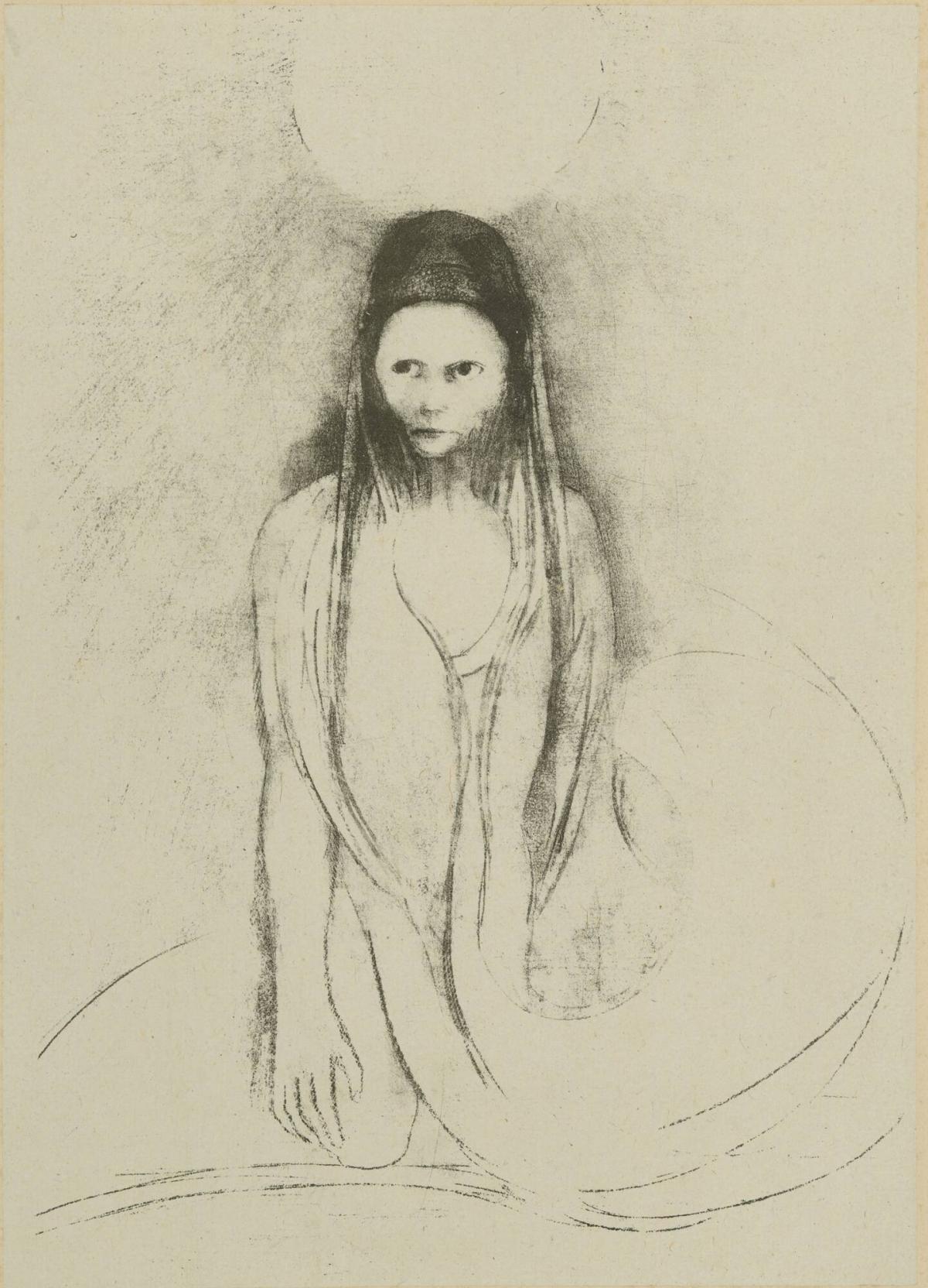 Not on viewA kneeling androgynous figure in a headdress and flowing garb is enveloped in light emanating from a disc, which could represent either the sun or a flower. Probably intended as a scene of meditation or enlightenment, Redon’s image refers to a section of Flaubert’s text that characterizes the Buddha as a “crazed magus.” In Redon’s interpretation, however, the figure does not seem to follow the same pejorative characterization. Although Redon displayed a consistent interest in Eastern religions, perhaps seeking an alternative to Catholicism, his incorporation of exotic mystical elements remains eclectic and ambiguous in meaning.