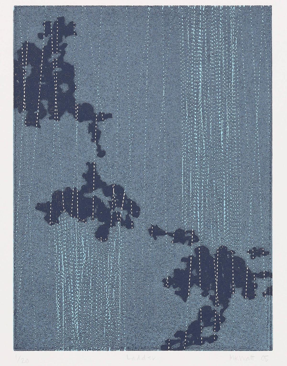 Watt is best known for her sculptures made from used blankets and tin jingles. In this print, Watt combines her material interest in textile with her background in printmaking, using a sewing roulette wheel to puncture the woodblock from which these prints were made.