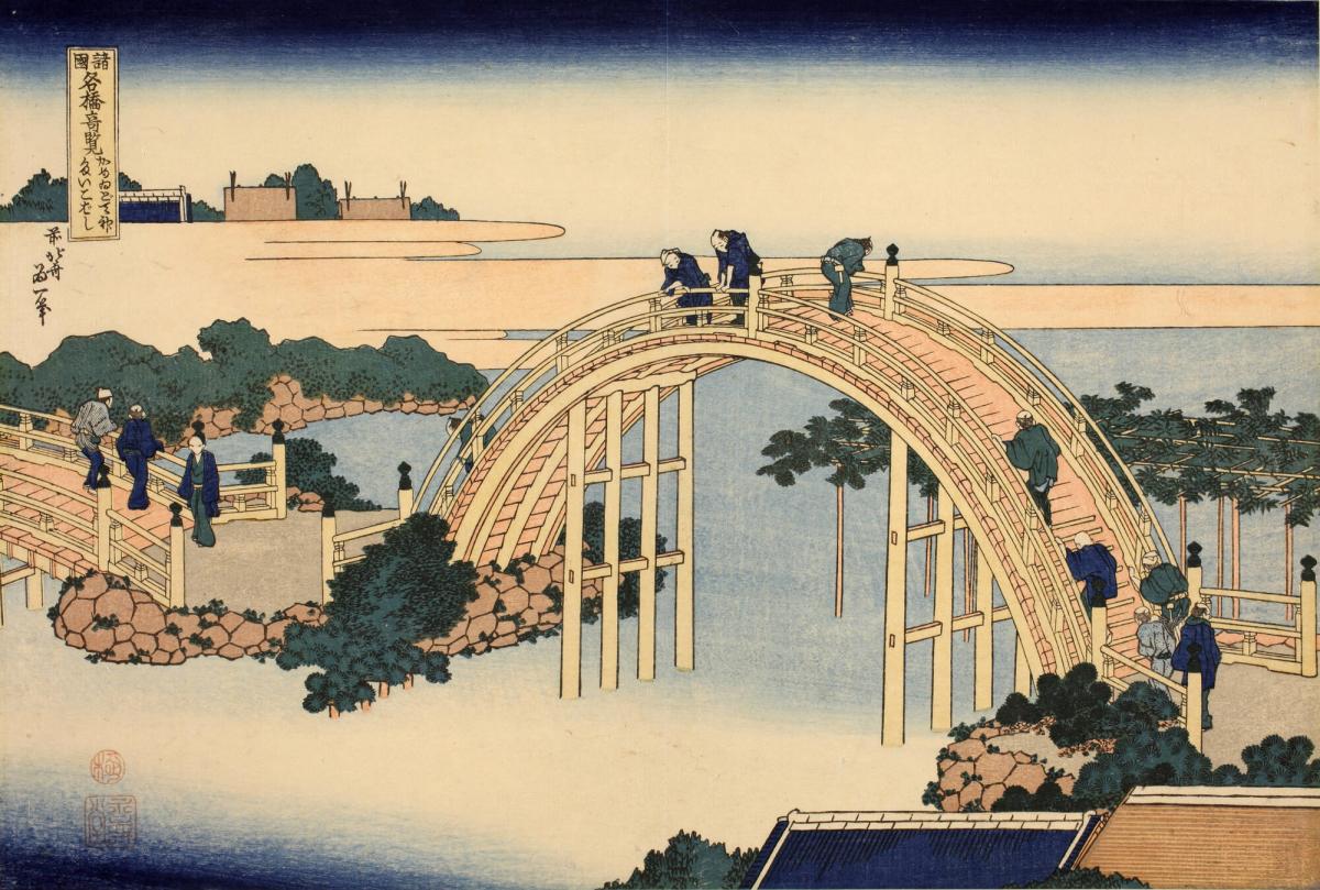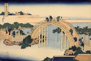 Not on viewIn this print Hokusai presents a large, arching drum bridge reminiscent of the giant drums used in festivals and rituals. The Kameido Tenjin shrine was celebrated as a meisho, or famous place or scene, for its beautiful wisteria trellises. In this print, the trellises can be seen behind the bridge on the right side of the composition, but the flowers are not yet in bloom. The drum bridge is depicted as though viewed from above and at a diagonal rather than from straight across, giving the scene a sense of depth and spatial expanse.