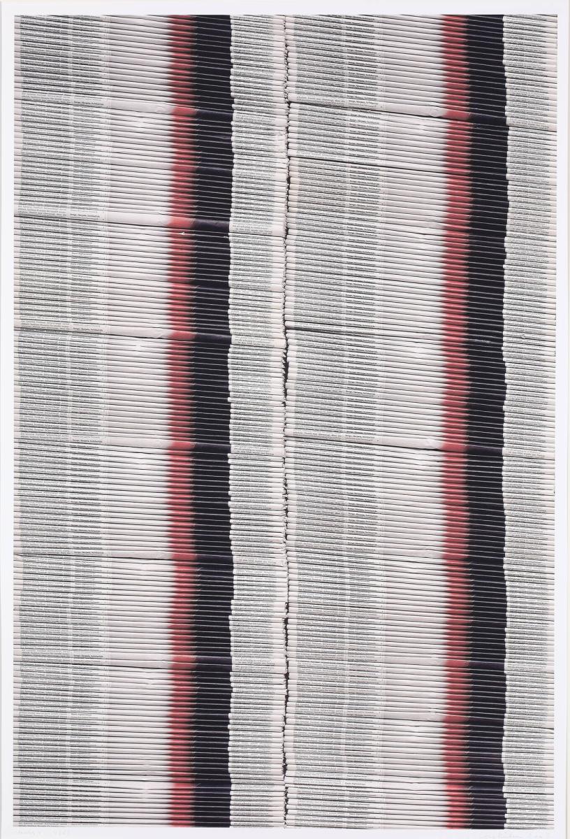 Not on viewPart of the series 9/11 Stacks , this print depicts stacks of the newspaper Die Berliner Zeitung published in the days immediately following the World Trade Center attacks of 2001. In addition to creating a conceptual meditation on the monotony of the news cycle, the side-by-side comparison of the paper from one day to the next shows the rapid reduction in scale of the front-page images of the attacks. The work addresses the inadequacy of mass-produced grainy images to memorialize the lives lost and to convey the scale of the event. Using a large format, the artist isolates two stacks in each work, reminiscent of the Twin Towers.