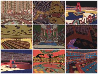 “ KNOWMAD (the game) is mapped from a real world of tribal groups that are being currently eradicated by political and civil change. The cultural icons from various tribes as found in the rugs they weave are recharted here in a virtual world of gaming. Women knot bits of wool and create evidence of human survival. In KNOWMAD these motifs are used by the programmer and designer as they keystroke pixels of color into a wire-framed world.