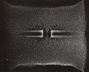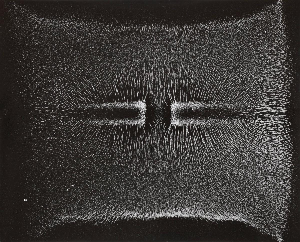MIT hired Abbott in 1958 to produce photo illustrations for a new physics book. So luscious and surreal were the results that they were featured in magazines of the time and considered alongside current events such as the launch of the Sputnik satellite. These works include images of water rippling, parabolic mirrors, balls moving through space, and—seen here—magnets attracting. They are rigorously scientific, yet the anthropomorphic aspect is rooted in Abbott’s Surrealist roots. To create these unprecedented images, she developed an enormous photographic apparatus, which she called “Super Sight.”