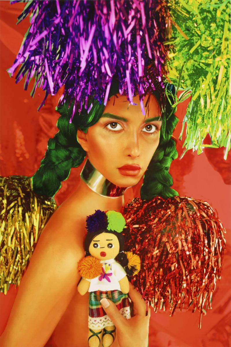 On viewGutierrez produced this self-portrait as the cover for her limited-edition fashion magazine, Indigenous Woman. A trans artist of Mayan Indigenous heritage, she assumes feminine archetypes of beauty and celebrity on every page, deploying kitsch and camp as critical devices to undermine normative beauty ideals. She asks, “How can we work against the very power structures that propagate beauty and normalcy to the masses?” With tinsel pom-poms and a Mayan doll, she references her ancestral culture while caricaturing a cisgender, hetero, Western gaze.