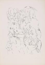 Not on viewThe word Kaschemme comes from Romani language, referring to a disreputable bar or restaurant. In this seedy and cramped space, subjects drink, smoke, and dance to music issuing from a gramophone. Almost none look at each other, and when they do it is with a hollow, lifeless expression. Their psychological emptiness and fatigue is typical of graphic work from Weimar-era Berlin.