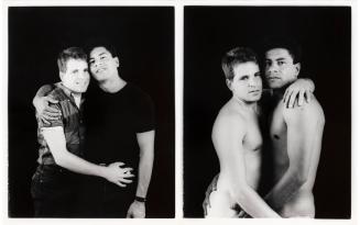 This diptych comes from Aguilar’s largest series, comprising 35 portraits of the artist’s close friends, taken between 1990 and 1994. Here, she features a young, interracial gay couple in two moments that reveal emotional layers of intimacy—public and private, clothed and unclothed, smiling and serious. Helmut Newton’s 1980s series Sie Kommen (Naked and Dressed) offers a precedent for this series, but whereas the fashion photographer’s showcases tall, skinny, white models, Aguilar celebrates bodily variation and diversity. Aguilar’s subjects are often her community or her own body. Aguilar was a central figure in Chicanx and queer art communities in Los Angeles beginning in the 1970s. She did not speak Spanish and much of her work addresses experiences of feeling silenced and in-between for those of Mexican heritage living in the U.S. Queerness and disability are also themes in Aguilar’s work.