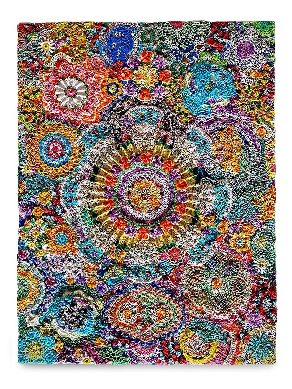 These radial forms and brilliant colors recall Canboulay, a precursor to carnival in Trinidad and Tobago, which Ové celebrated as a child. Having grown up around his family’s dress shop, Ové is interested in honoring the anonymous women laborers who made these doilies, which he sourced globally. “I became interested in a sort of ‘Granny Psychedelia’—that these doilies were often made by repressed women through the 1970s and 1980s in Catholic homes across South America, Eastern Europe, and Africa.”