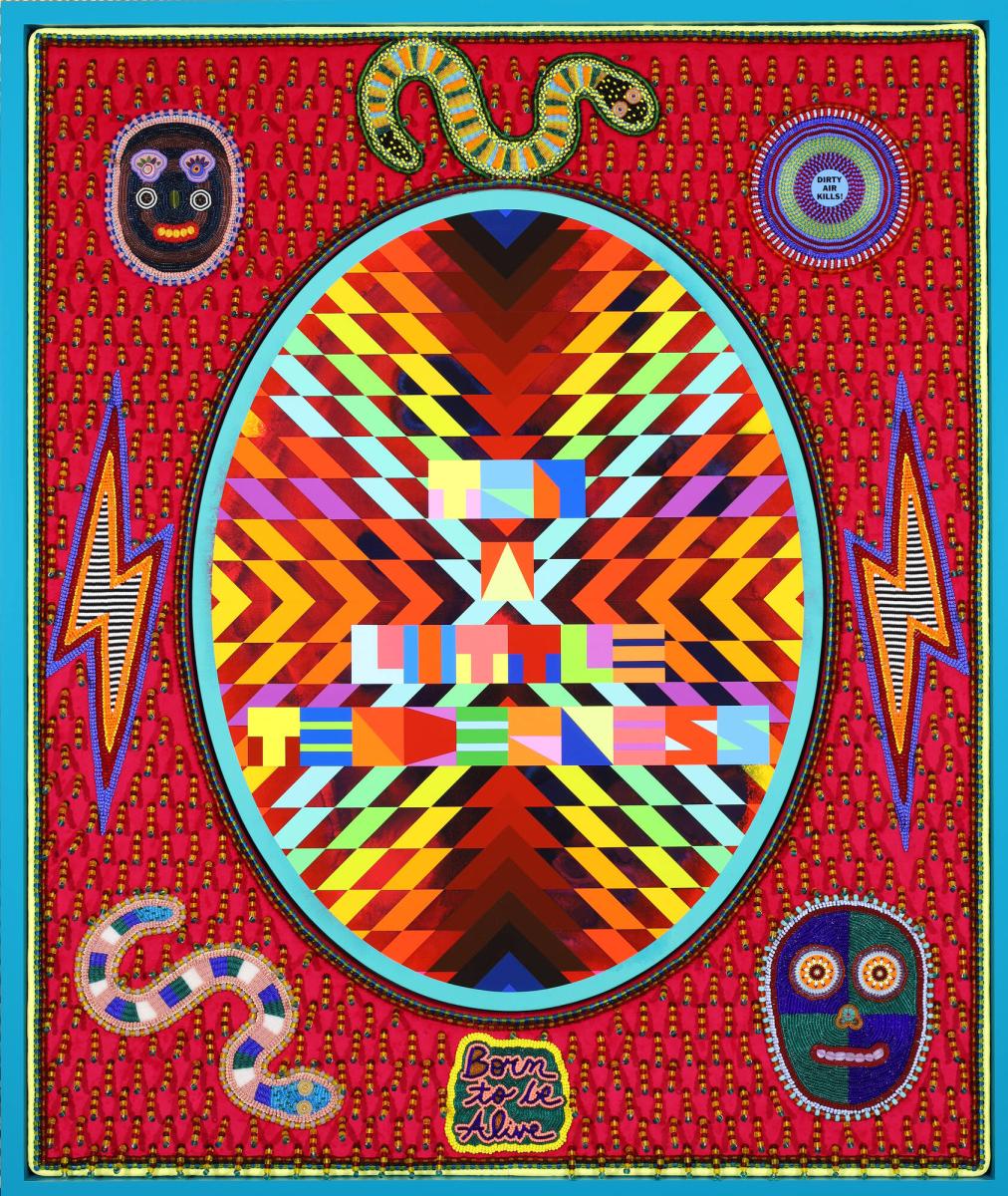 Provenance(Sikkema Jenkins & Co., New York); purchased 2023 by Allen Memorial Art Museum, Oberlin, OHGibson has reimagined the handheld “whimsies” as monumental works. The phrase in the center, “Try a little tenderness,” comes from a song recorded in 1932 and covered by Soul artist Otis Redding in 1966. The beaded text at the bottom, “Born to be alive,” is the title of a 1979 Disco song by French singer Patrick Hernandez. Along with faces, snakes, and thunderbolts, a pinback button declares “Dirty air kills,” invoking environmental activism and the occupation of Indigenous territories. As we come to terms with this history and the challenges of environmental degradation, Gibson reminds us that Indigenous Peoples have always been at the vanguard of movements to protect Earth.