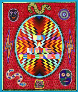 MediumAcrylic paint on canvas inset in custom frame, acrylic velvet, acrylic felt, glass beads, turquoise, metal beads, vintage pinback button, vintage beaded elements, artificial sinew, nylon thread, cotton canvas, nylon and cotton rope