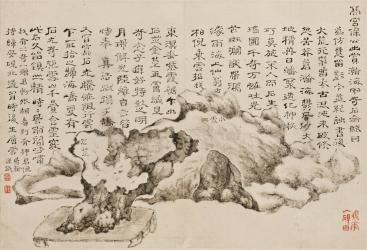 Mister Bao in the Gao residence displayed a miraculous rock called Hànhǎiyǔ (Desert-feather). A painting [ of the rock ] is attached. [ I ] sketched out [the rock] to keep it in my memory. [ I ] humbly wrote down some text on the side: