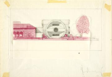 Not on viewThis is the earliest drawing for Alternate Proposal with only the front elevation of one plug visible. Oldenburg incorporated a collaged rendering by the Venturi office to represent the Gilbert façade and characteristically made his plug addition appear colossal in relation to the architecture, drawn at the lower right-hand corner. The Venturi wing is presented on the scale of sculpture, suggesting a comparison between both objects in a "poetry of scale" and providing the punch line of Oldenburg's witty dialogue with Venturi's self-consciously "decorated shed."