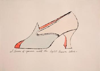 Not on viewWarhol created this hand-colored print while working on a shoe advertising campaign for I. Miller & Sons. Ink outline drawings were reproduced and hand-colored by the artist and a team of friends for an illustrated book with poems about shoes by Ralph Pomeroy. The book’s title is a reference to Marcel Proust’s novel À la recherche du temps perdu (In Search of Lost Time), which had important associations for Pomeroy. Warhol’s mother added the calligraphy.