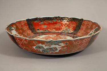 Imari ware (imariyaki 伊万里焼) is named after the port city that exported wares made at the nearby Arita kilns on Kyūshū, the southernmost of the four main islands of Japan. Kaolin clay is required for porcelain production, and northwestern Kyūshū was the source for the earliest known kaolin clay deposits in Japan. Many of Japan’s most famous porcelains were made in the area. Although Imari ware is found in a variety of types, this 19th century example follows the earliest 17th century style of decoration, which in turn followed Chinese models. The blue comes from cobalt oxide painted on the clay, covered with a transparent glaze and fired at a high temperature. The red, green, and gold colors are overglaze enamels, painted on top of the first glaze and fired at a lower temperature.