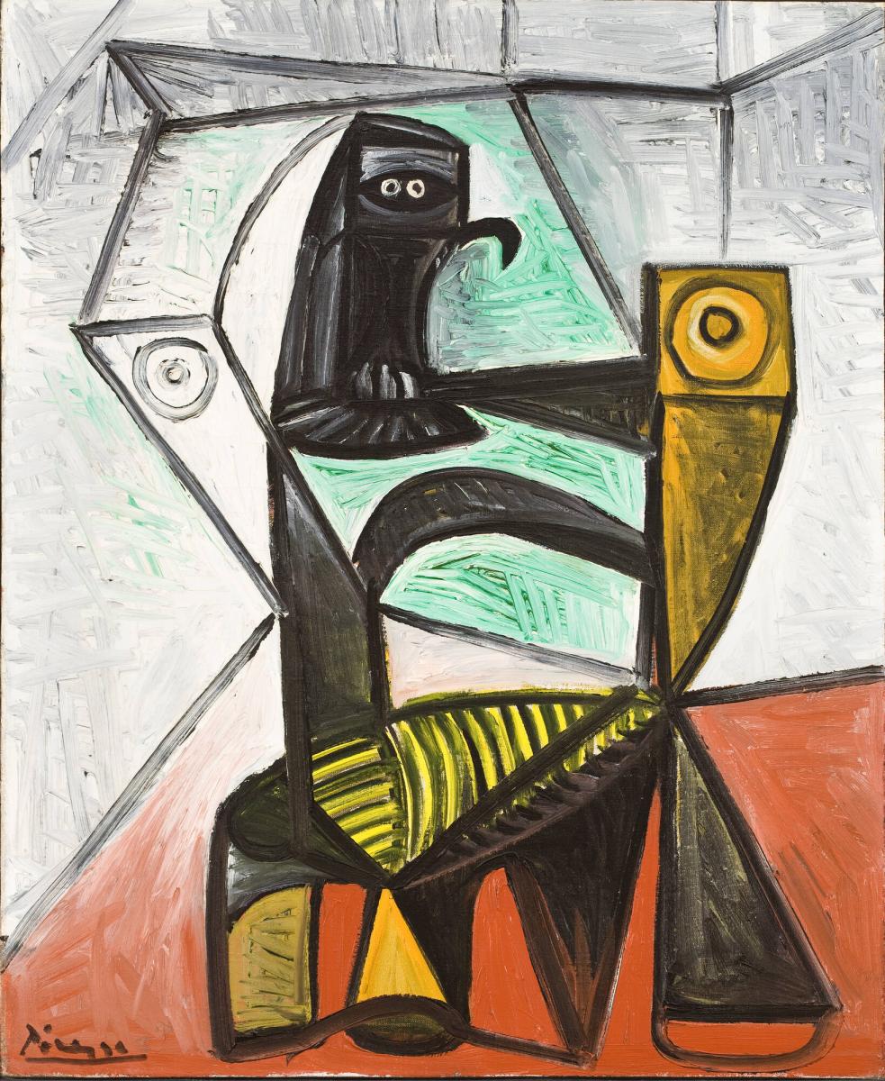 Not on viewThis important painting was made in the wake of the Second World War, at a time when Pablo Picasso's works were turning from pessimistic to optimistic themes. Although in 1943-44 he painted a number of still lifes with skulls, Picasso moved to Antibes with Françoise Gilot in the summer of 1946 and began a new series in which animals and birds, as well as the ambience of the Mediterranean, marked a new moment of happiness in his work. The photographer Michael Sima had given him a small live owl as a gift-the bird was both the symbol of Antibes and of the goddess Athena-and Picasso proceeded to paint it in a number of works. The AMAM's painting shows the owl perched on a caned and wooden chair.