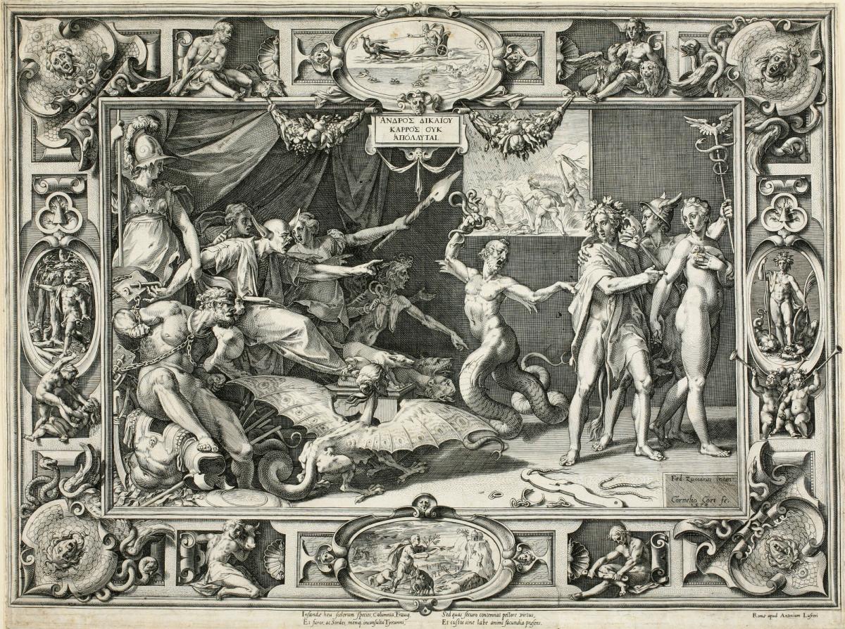 Not on viewCort made this engraving after Federico Zuccaro’s painting of the same subject, which was a recreation of a lost painting by the Greek master Apelles based on ancient literary sources. In this scene a judge accuses an artist of misdeeds, but the charges are based on slander from a rival. The judge’s ears have grown long and bat-like from listening to Anger (in chains), Envy (the winged creature), and Deceit (the man with serpent legs). The woman to the king’s right, holding a torch, personifies Calumny. On the right, the artist is being led away by Mercury and a personification of Truth, or some say Innocence. This allegory was widely known and appreciated by Renaissance artists and scholars, indicating their admiration for antiquity. This subject also addressed Renaissance artists’ wish to rival the accomplishments of their forebears and suggests that competition and rivalry were commonplace in the artistic community.