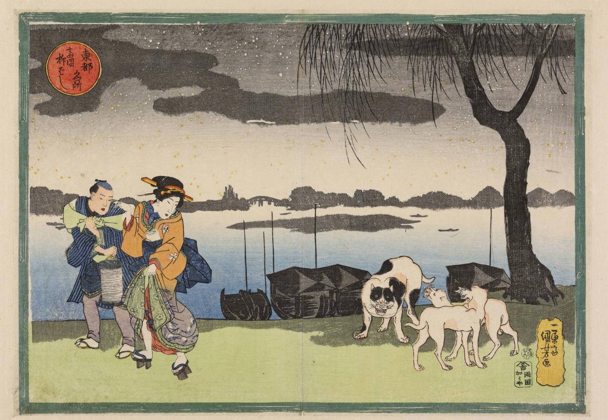 Geisha, Attendant, and Three Dogs near Yanagi Bridge at Ryogoku, from the series Famous Views of the Eastern Capital