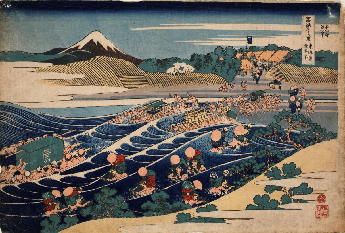 Fuji from the Ford on the Oi River at Kanaya on the Tōkaidō, from the series Thirty-six Views of Mt. Fuji