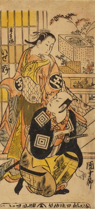 Not on viewThis print illustrates a scene from the play Nigiwai kuruma Genji, which was performed during the seventh month of 1727. The actors are identified by the inscriptions at their sides, and also by their actor’s crests.