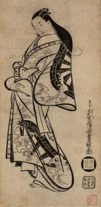 The school became known for a distinctive subject and style in paintings and in prints, seen here. A courtesan, identifiable by her sash (obi) being tied in the front, stands against a blank background. In a simple but elegant composition, her body sways forward in an arc that is countered by the downward thrust of her sleeve and the signature and seals below. The careful thick and thin of the calligraphic outlines create bold and dynamic swoops, matched by the water wheels and turbulent waves on her kimono.