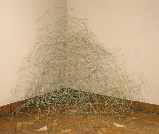Not on viewSun Register exemplifies Saret's early post-minimalist sculpture in its use of inexpensive industrial materials and lyrical evocation of the natural world. His use of an unconventional medium-fencing wire-is malleable, indeterminate, and insubstantial, suited to his casually composed and intentionally temporary forms. In this piece Saret subverted the grid like orderliness of the medium and its purpose, the delineation of boundaries. Saret, who studied painting before turning to sculpture, also incorporated painterly gesture in this work, unevenly spray painting the strands of wire in soft shades of yellow and blue-green.