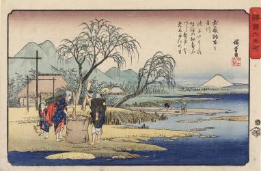 Women Pounding Cloth beside the Chofu Tama River in Mushai Province, with a Poem by Fujiwara no Teika, from the series The Six Tama Rivers in the Provinces