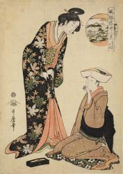 Not on viewUtamaro’s print of two elegant women uses mitate—a technique that cleverly merges classical and contemporary elements. The print references Fishing Village in Evening Glow from the Eight Views of Xiāoxiāng, creating an interplay between high and low culture. While the original view symbolized simplicity, tranquility, and impermanence through a fishing village at sunset, Utamaro reinterprets these themes through two beautiful women in an evening scene. By substituting the sunset’s glow with the “evening glow” of the women, he preserves the original’s essence of fleeting beauty while adding playful contemporary relevance for Edo audiences.