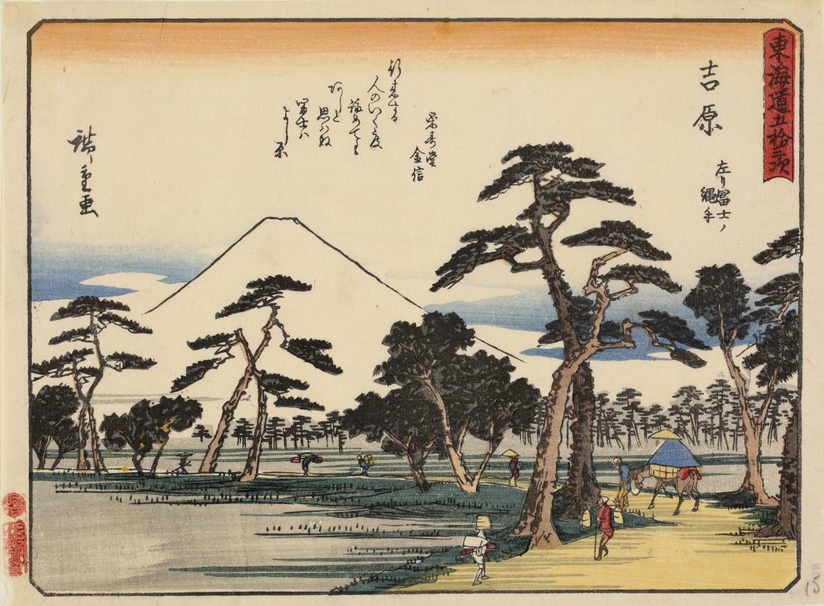 Fuji on the Left from the Road through the Rice Fields at Yoshida, with a Poem by Eijudo Kanenobu, no. 15 from the series The Fifty-three Stations of the Tōkaidō