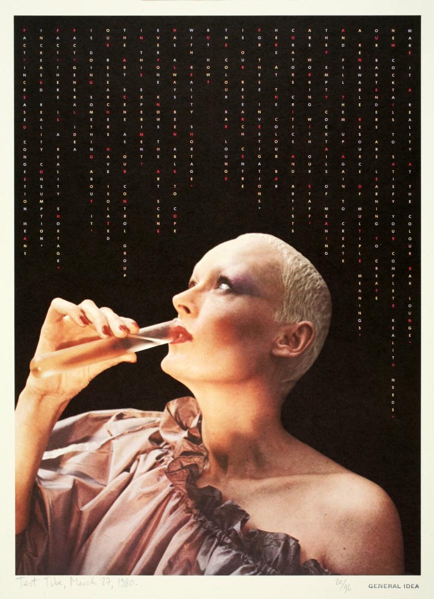 Not on viewArtists A.A. Bronson, Felix Partz, and Jorge Zontal worked together for 25 years under the moniker General Idea. They addressed consumerism, the manipulative power of the media, the commodification of art, and AIDS—which claimed the lives of Partz and Zontal. This photo is a still from their 1979 video, Test Tube, featuring guests of the Colour Bar Lounge in the Miss General Idea Pavilion—a fictional setting referenced in much of the group’s work. The video, commissioned by a Dutch museum for television broadcast, appropriated formats, including a talk show, a soap opera, and advertisements.