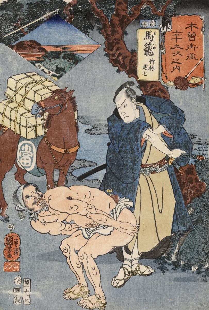 Magome: A Horse Leader Offering to Carry Takebayashi Teishichi Across a Stream on His Back, no. 45 from the series The Sixty-nine Stations of the Kisokaidō