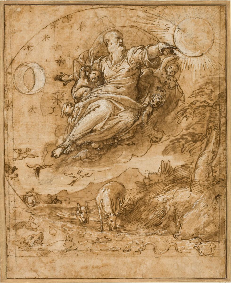 For this central, crowning scene, Zuccaro drew on the inspiration of Michelangelo's fresco God Creating the Sun and the Moon from the ceiling of the Sistine Chapel. Zuccaro, however, changed the direction of God's prominent gesture and gave him a more placid countenance. He also chose to diverge from the narrative that Michelangelo depicted in his fresco (which shows parts of the third and fourth days of creation) and depicts the fourth, fifth, and sixth days by including a landscape scene with grazing animals, birds, and fish. He also modified the composition's overall shape to a circle rather than a slightly elongated rectangle, thereby cutting off much of the sun and the snake and some of the fish and shells at the bottom.