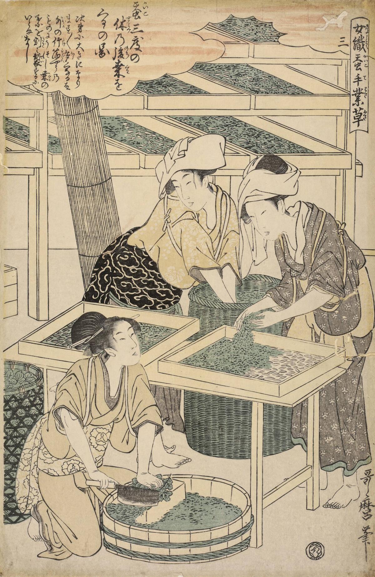 Images of the stages of silk production, or sericulture, date back to 12th-century China. This sheet, based on an earlier print series from 1772, is the third in an amazing work by Utamaro that links twelve sheets together in an unbroken composition.