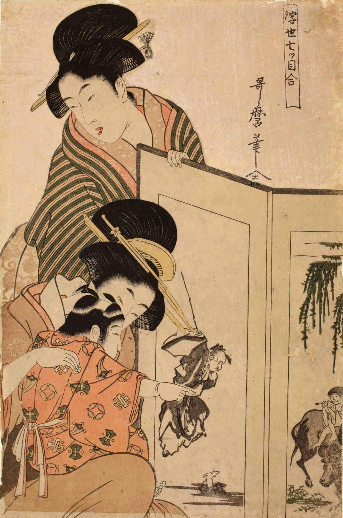 Not on viewIn this cozy domestic scene, two women look at a folding screen with a small boy. The painted screen on the left depicts the Chinese Daoist immortal Huang Chuping, who magically turns a white stone into a ram. On the right-hand screen, a boy rides an ox while playing a flute. Linking these two images is their connection to the sequence of the twelve animals of the Chinese zodiac. The ram and the ox are seven animals apart. The year of the animal falling seven years after one’s birth-animal year was believed to be especially lucky. This print was one in a series of six, each with a different animal pair.