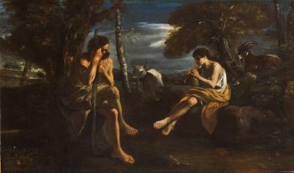 On viewThis seemingly serene scene by Pier Francesco Mola is an episode from Ovid's Metamorphoses showing the god Mercury, his winged staff behind him, lulling the giant Argus to sleep by playing music on a pipe. In the tale, Argus-here depicted with lidded eyes, leaning heavily on a wooden staff-had been entrusted by Juno with the care of Io, a princess whom the jealous goddess had turned into the cow seen in the painting's center. Jove, in love with Io, sent Mercury disguised as a goatherder to kill the giant, thus setting Io free.