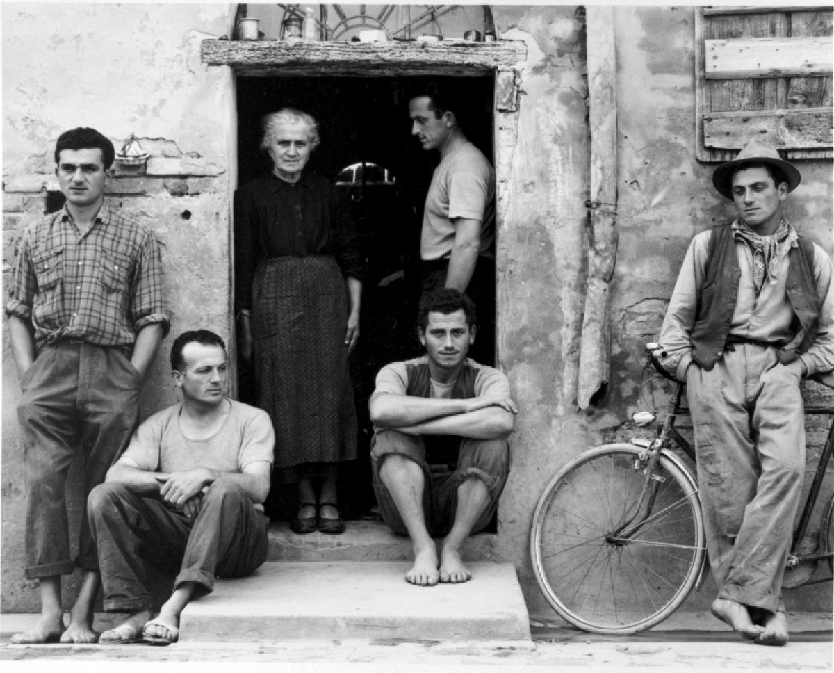 As part of his travels in Europe during the 1950s, Strand spent time in Luzzarra, a small town in north central Italy, photographing its inhabitants and their surroundings. This incisive portrait of a family highlights the Italian tradition of sons remaining in the home well into adulthood. An elderly mother is surrounded by her grown sons, who populate the entrance to their home. Whether due to economic circumstances or cultural expectations, many families rely on multigenerational households that preclude or impinge on the independence typically associated with adulthood in Western cultures.