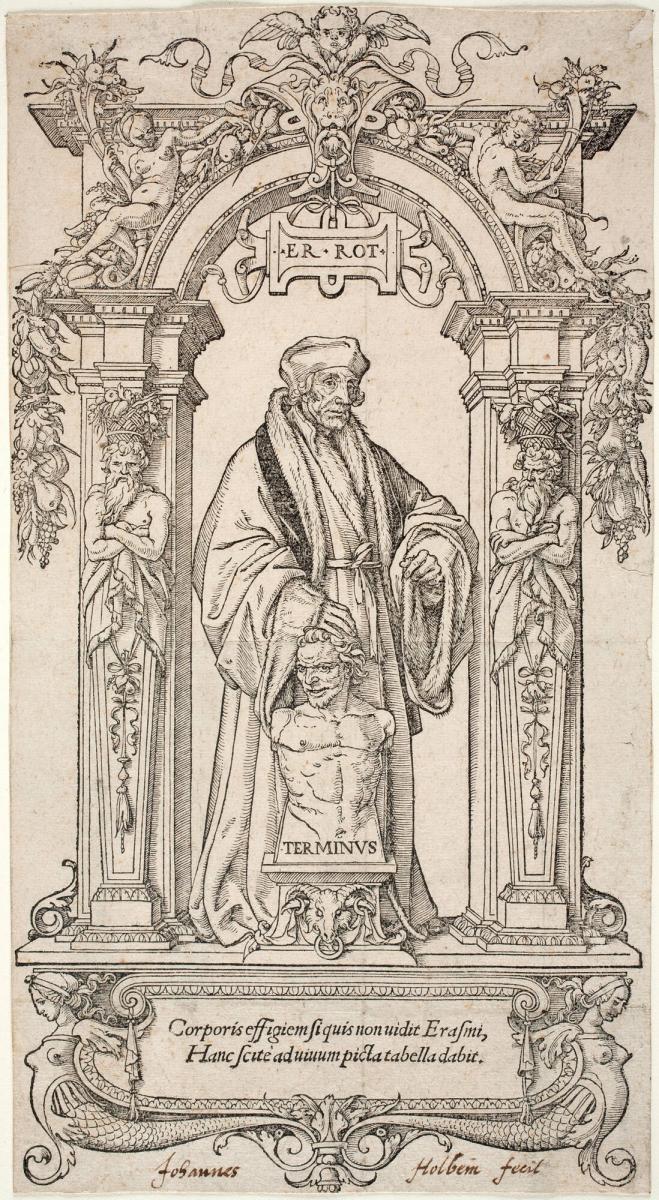 Not on viewDesiderius Erasmus (1465-1536), a Dutch humanist and scholar, held significant clout in the political and intellectual arenas of sixteenth-century Europe. It was through Erasmus' acquaintance that the German artist Hans Holbein the Younger gained entrance into important artistic circles in England. One of several portraits of Erasmus completed by Holbein, this print shows Erasmus standing under an ornately decorated arch, accompanied by the Roman god of borders, Terminus. Erasmus used this god, represented here as a bust on a boundary stone, as a personal emblem. Terminus' menacing gaze, Erasmus' dignified stance, and the intricate decorations that surround the arch all function as visual signifiers of Erasmus' importance and power, as well as of Holbein's esteem for the scholar.