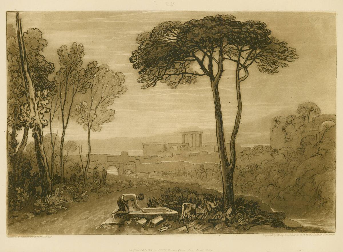 Not on viewThe sun rises (or sets) within a classicizing landscape with Roman ruins, in which two trees dominate the composition. J.M.W. Turner himself referred to this scene as “Tall Tree,” reaffirming the formal analogies with the massive framing trees in the 17th-century landscape painting of Annibale Carracci, Domenichino, and Nicolas Poussin. In the foreground, a woman kneels by a stone trough in what may be an act of purification. Two shepherds, standing near their flocks, converse. The compositions in Turner’s Liber Studiorum, of which this forms a part, were divided into genres. This was labeled E.P. for “Elevated Pastoral,” a category that underscores its association with renewal and consolation and with a genre of moralizing landscape.