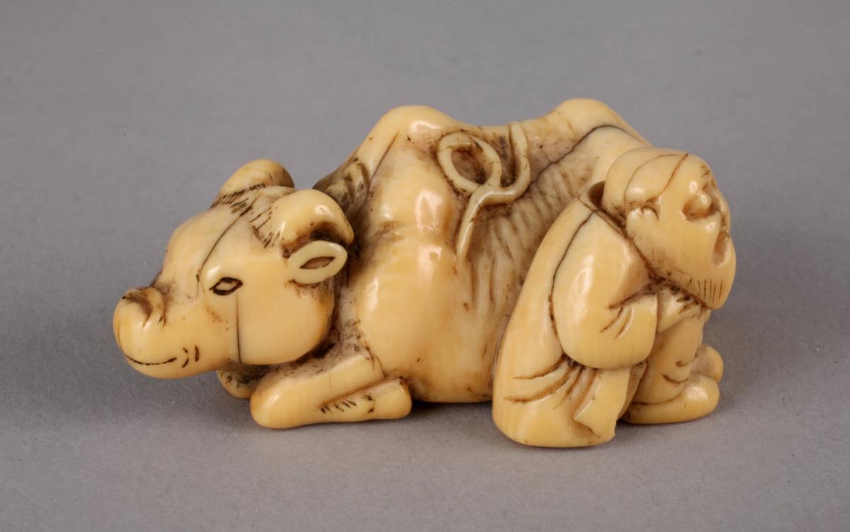 Netsuke of an Old Man Squatting Beside an Ox