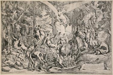 Not on viewA significant figure of the Italian Baroque, Testa was a prolific etcher, often finding more success in his printed work than in his paintings. In the complicated iconography of this print, Testa gives idealized form to his preferred topics: the creative process and the intellectual nature of the painting profession. On Mount Parnassus, home of the muses, the chariot of Painting enters into a scene that illustrates the struggles and passions the artist must conquer and express, particularly the extremes of pleasure and pain, as represented by the pair of lovers and the figure attacked by serpents at left. Painting is crowned by the Three Graces as she rolls over the figure of Envy under the chariot’s wheels, passing underneath a triumphal arch of the rainbow bearing the figure of Iris, to greet the muses at right.