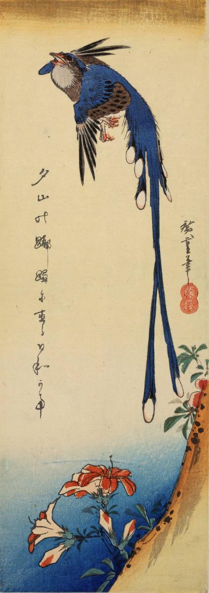 Long-tailed Blue Bird and Azaleas