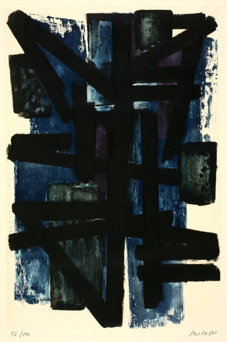 Whereas Abstract Expressionists embraced spontaneity, Soulages’s works are meticulously composed. The title of this work, Eau-fort (literally “strong water”) refers to the nitric acid used in the process of making an etching such as this.