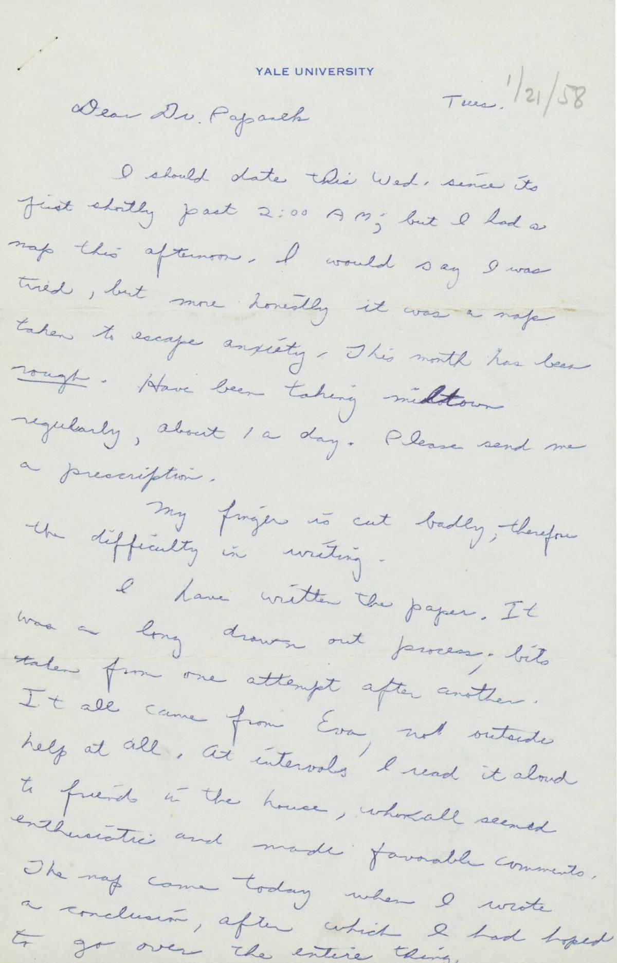 MediumTwo-page letter on blue pen white writing pad with Yale letterhead