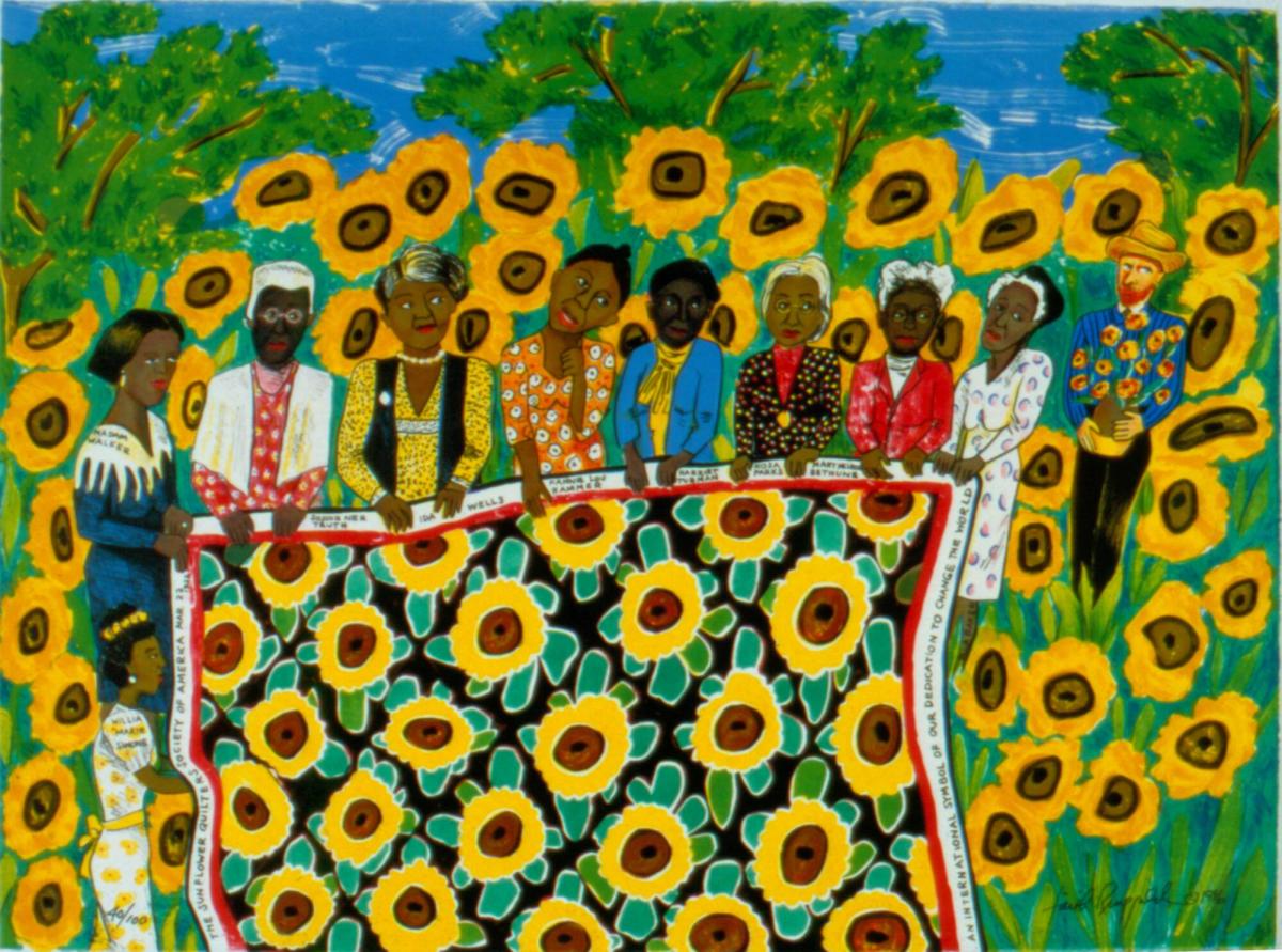 Not on viewThis lithograph is related to Faith Ringgold’s “French Collection” story-quilt series, which illustrates the travels of Willia Marie Simone, a fictional young artist who goes to Paris and meets a host of iconic male European artists. Here, Simone appears at the bottom left of the print. She is accompanied by eight influential African American women: Madame C. J. Walker (1867–1919), Sojourner Truth (ca. 1797–1883), Ida Wells (1862–1931), Fannie Lou Hamer (1917–1977), Harriet Tubman (ca. 1820–1913), Rosa Parks (1913–2005), Mary McLeod Bethune (1875–1955), and Ella Baker (1905–1986). These women are sewing a giant sunflower quilt, a traditional African American art form. Conspicuously separated from the group of women is the Dutch painter Vincent van Gogh. This print functions as a commentary on history’s celebration of white men’s achievements over those of African American women. The Sunflower Quilting Bee at Arles emphasizes the important contributions women made to the visual arts as they sew in the sunflower field, ironically the very subject of many of Van Gogh’s esteemed paintings.